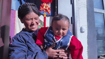 次仁拉姆在刚交付的新居前怀抱女儿格桑巴宗(2025年10月24日摄)。新华社记者 姜帆 摄