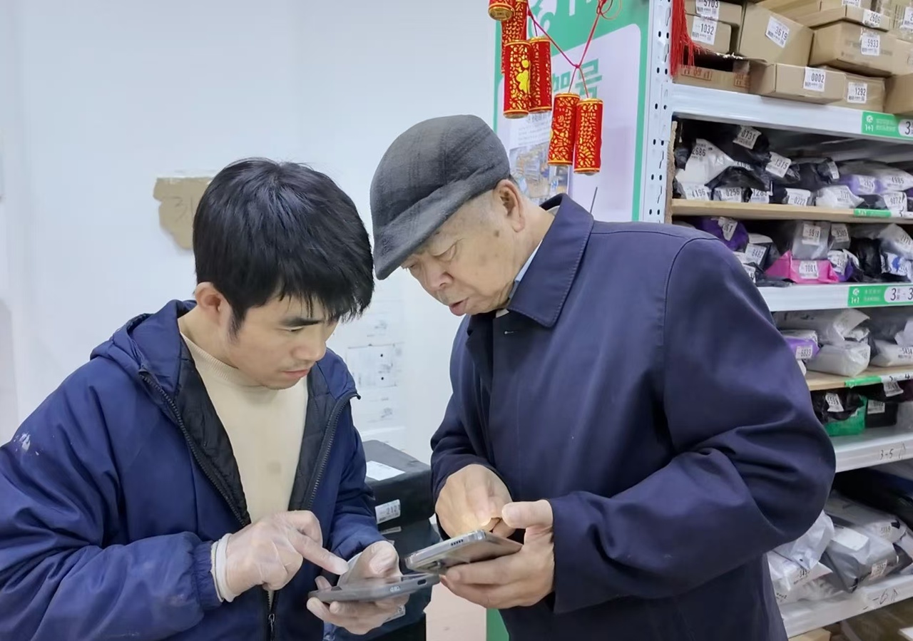 阮以熟用手机与前来领取快递的顾客交流。郑盛炜摄