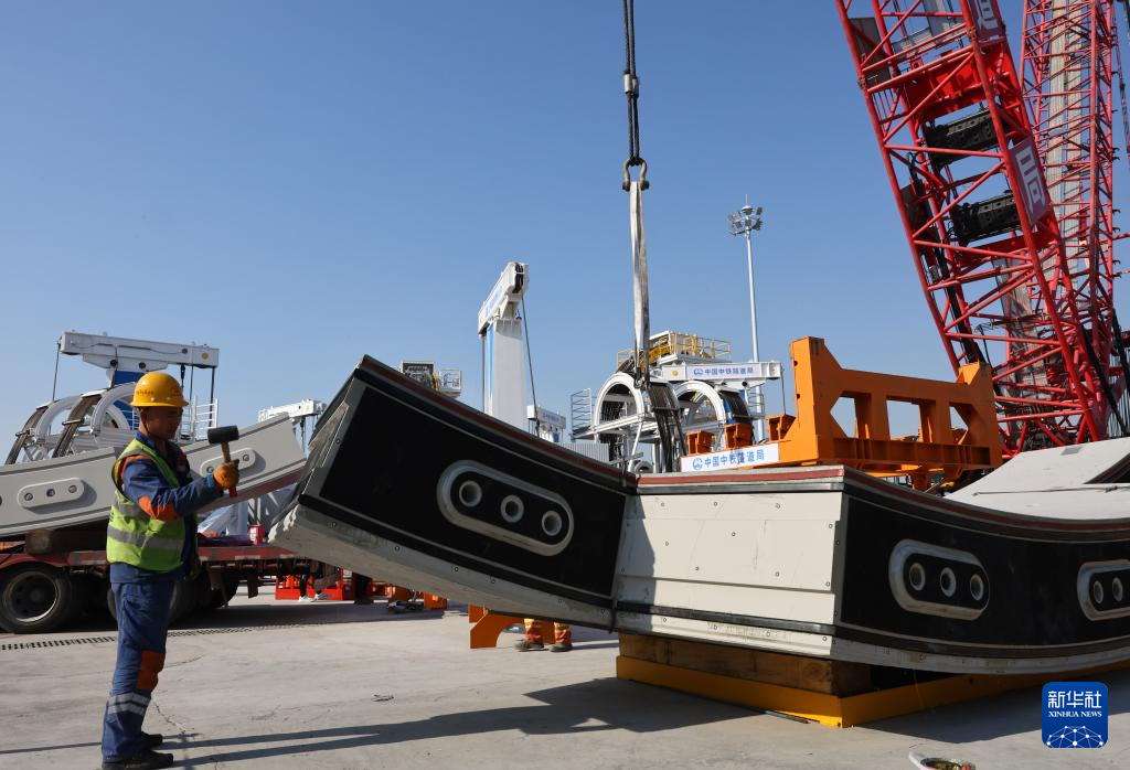 1月13日,在崇太长江隧道2号竖井项目施工现场,工人检查翼形管片上的传力垫片安装情况。新华社记者 方喆 摄