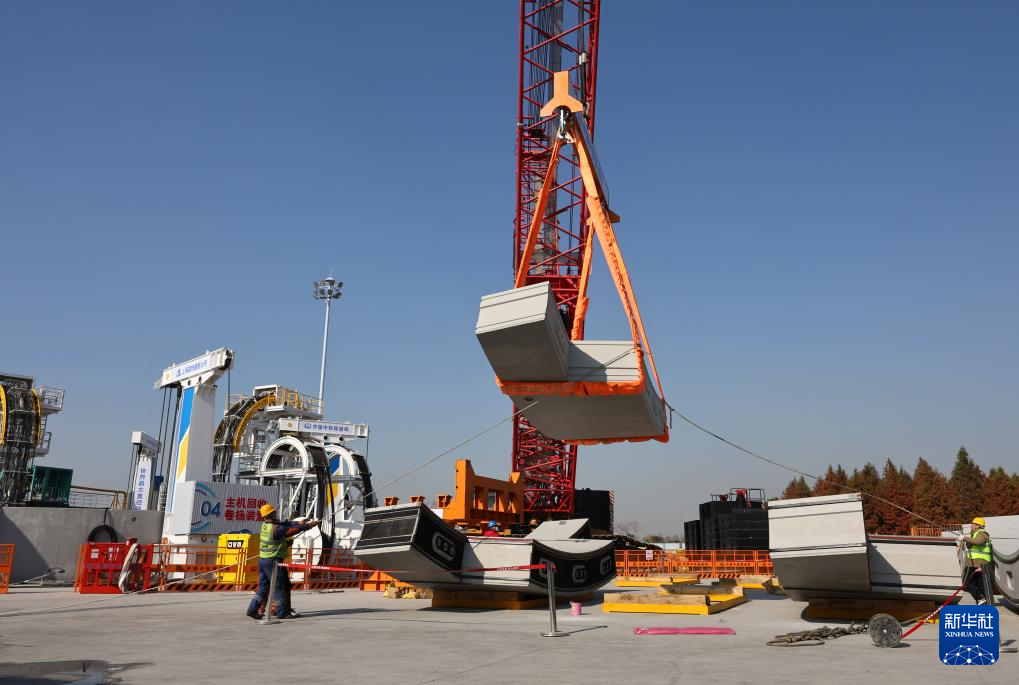 1月13日,在崇太长江隧道2号竖井项目施工现场,工人辅助吊机进行翼形管片吊装作业。新华社记者 方喆 摄