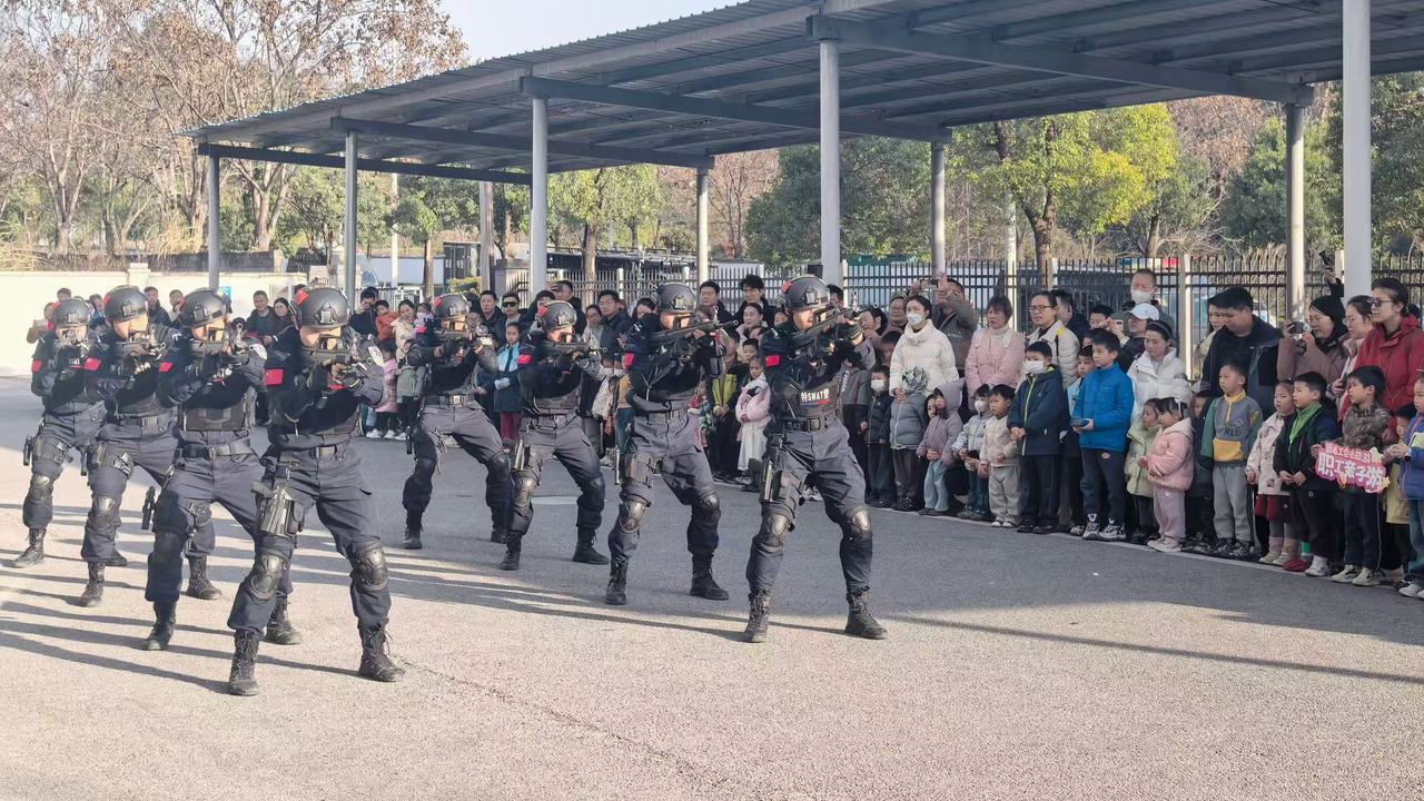 9名特警战士列队伫立,一身英气。孩子们蜂拥而上,将各色“勋章”挂满他们胸前——水果绶带、超级飞侠奖牌、纸杯徽章错落排布,为坚毅的身影添了几分灵动。这些非制式奖章,源自湖北宜昌90组职工家庭,是孩子们在第六个中国人民警察节里递出的专属敬意。