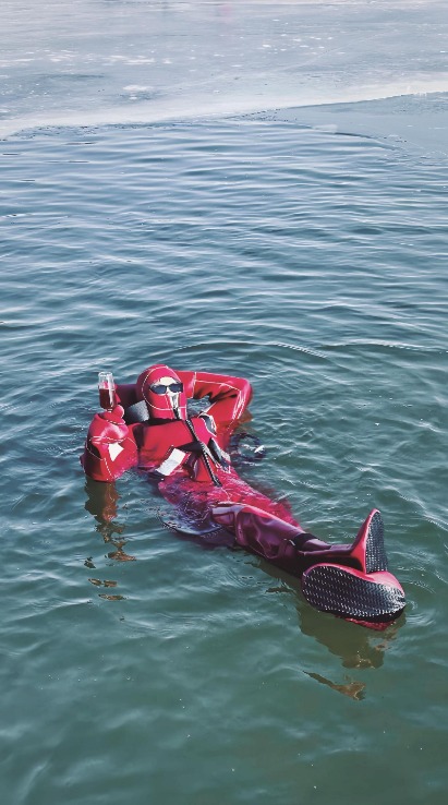 这份“躺平”的舒适与安心,全靠专业装备的加持。解刚刚介绍,冰浮服是特制的干式防寒服,看着厚实笨重,实则暗藏玄机——衣服背后的长方形气囊,能稳稳托住人的头部和肩部,确保上半身始终浮在水面之上,就像躺在柔软的枕头上一般惬意;加厚潜水服面料搭配隔热镀膜,全身密封只露出脸庞,既能隔绝冰水的寒气,又能牢牢锁住体温,完全不用担心受凉。“这衣服原本是船舶救生装备,经过海事局的认证,安全系数拉满,就算不会游泳也能放心玩。”