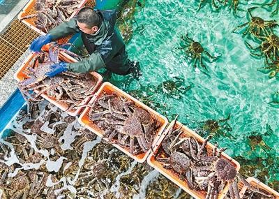 新疆吉木乃口岸优化通关服务,压缩通关时间,实现“即到即验”,让“丝路美食”加速走向餐桌。图为进口帝王蟹通过查验后准备装箱发往市场。人民日报海外版记者 李亚楠摄