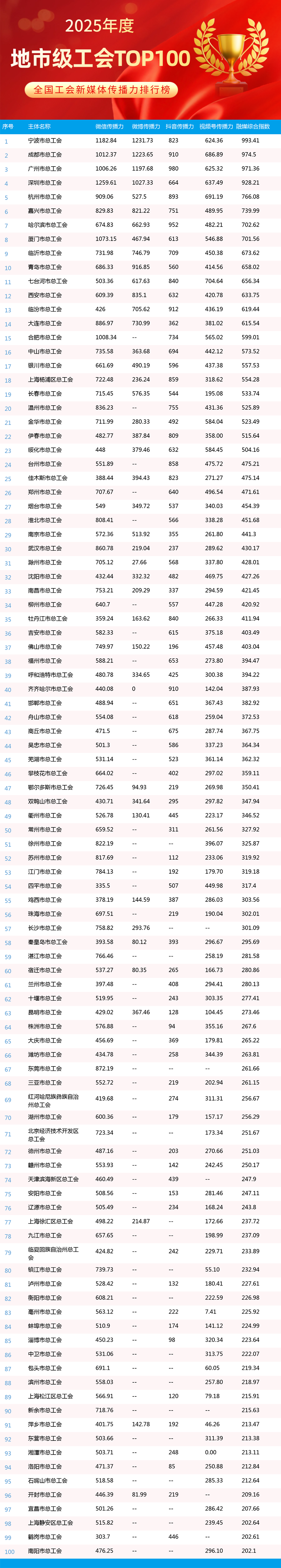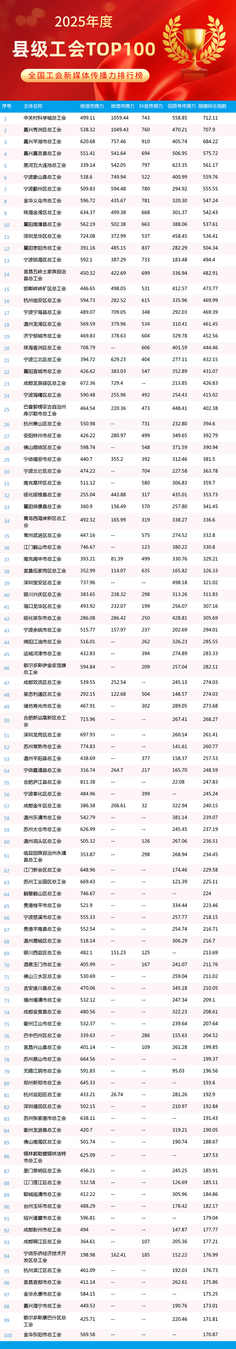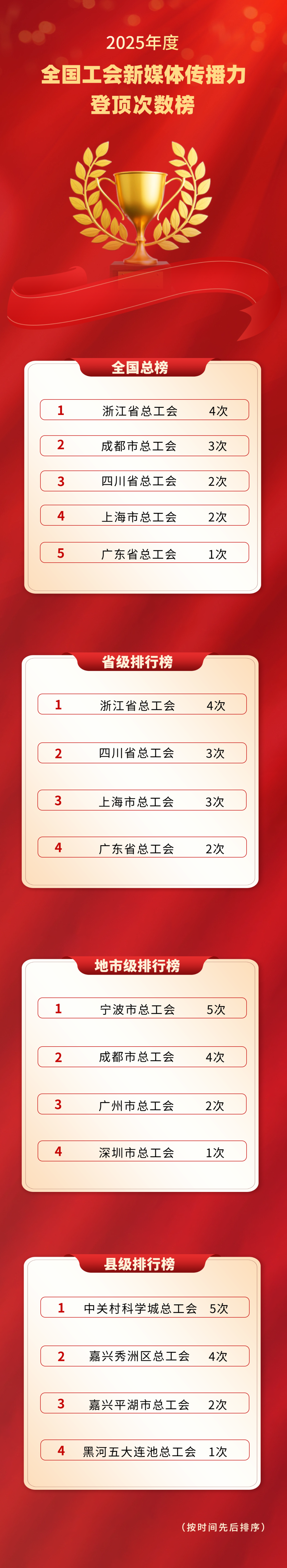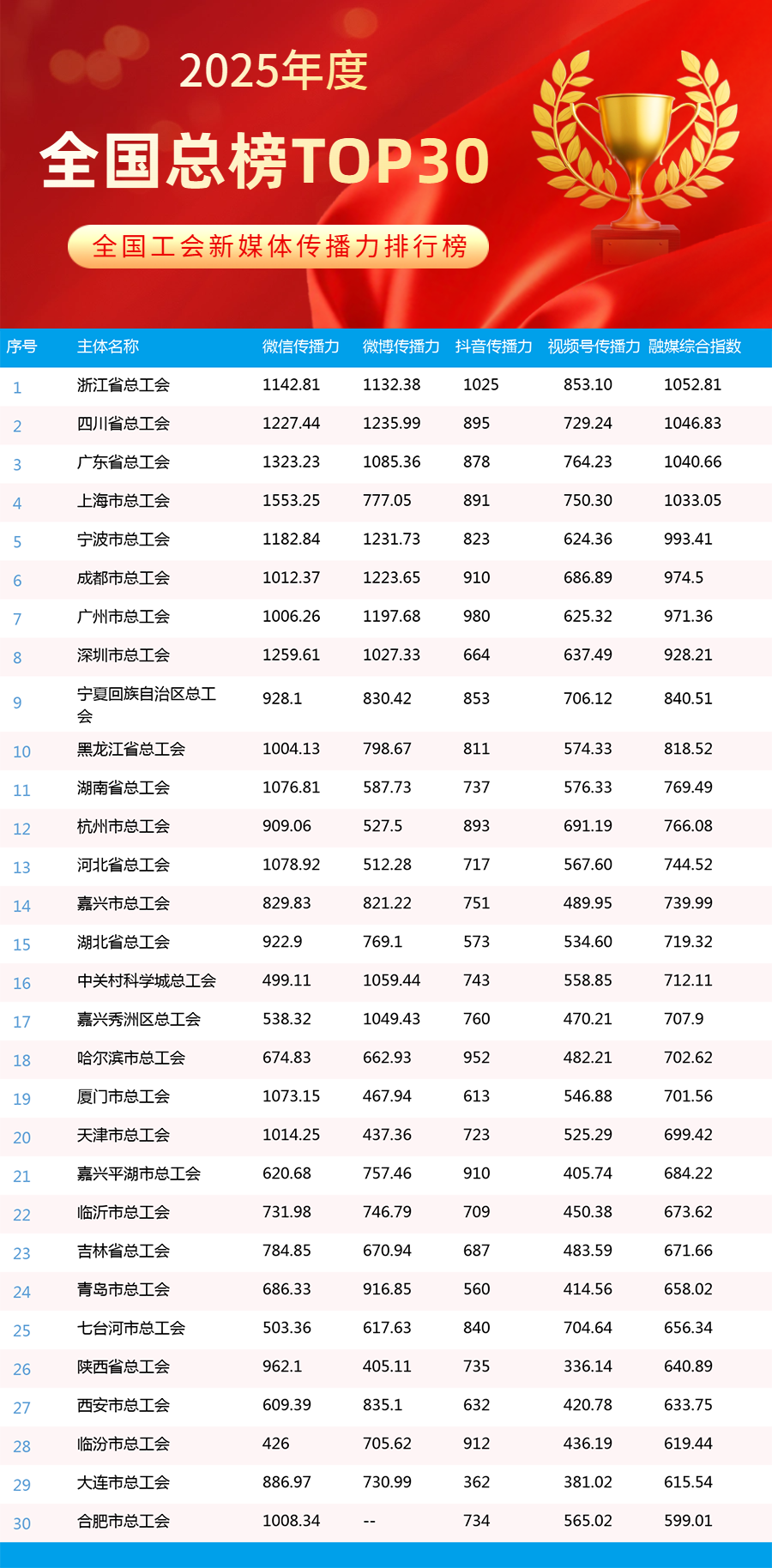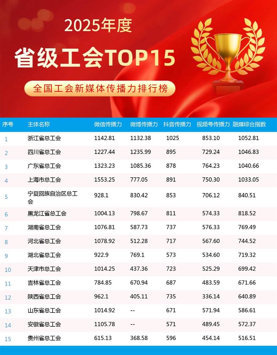 2025年,全国工会新媒体传播力排行榜持续发挥示范引领作用,全年发布年榜1期、月榜12期,为各级工会新媒体提供了重要展示窗口和交流平台。