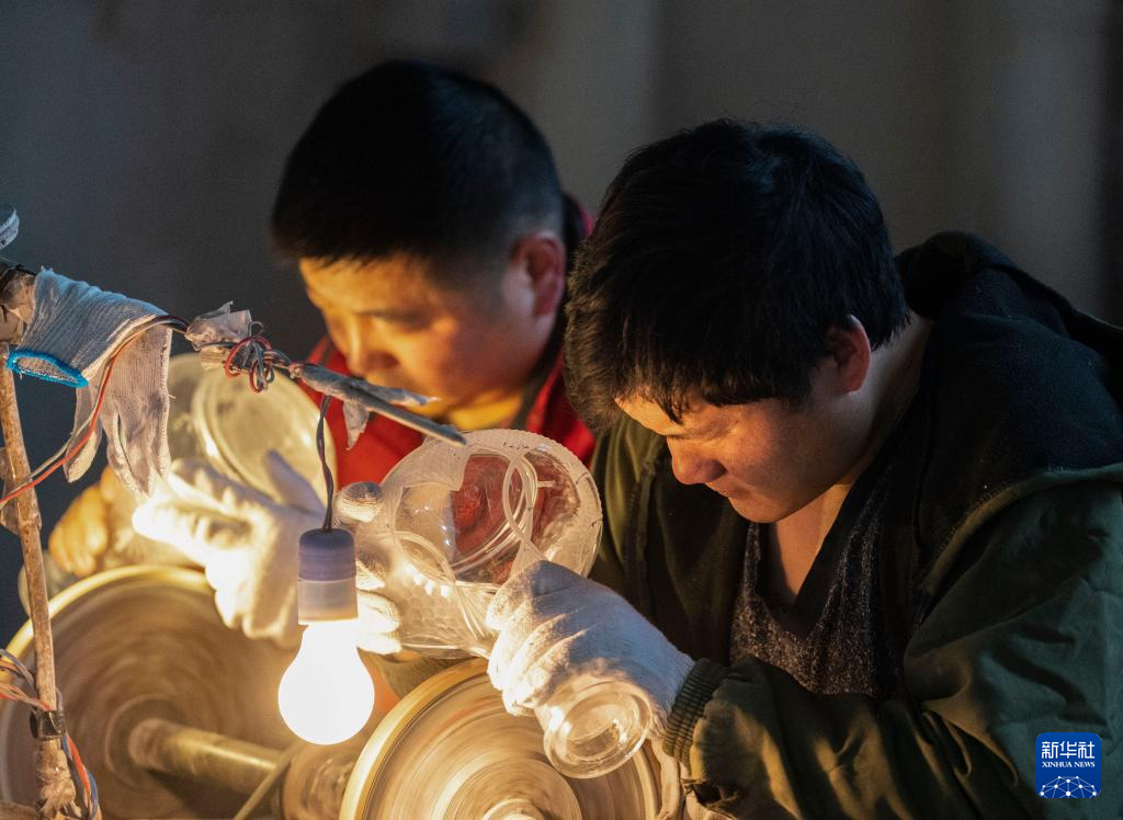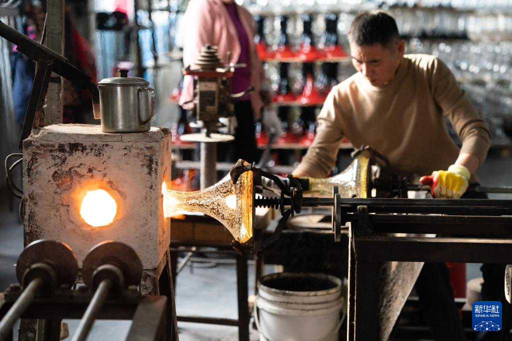 在安徽省天长市石梁镇石峰玻璃有限公司工厂,工人在制作水烟壶(1月14日摄)。新华社记者 杜宇 摄