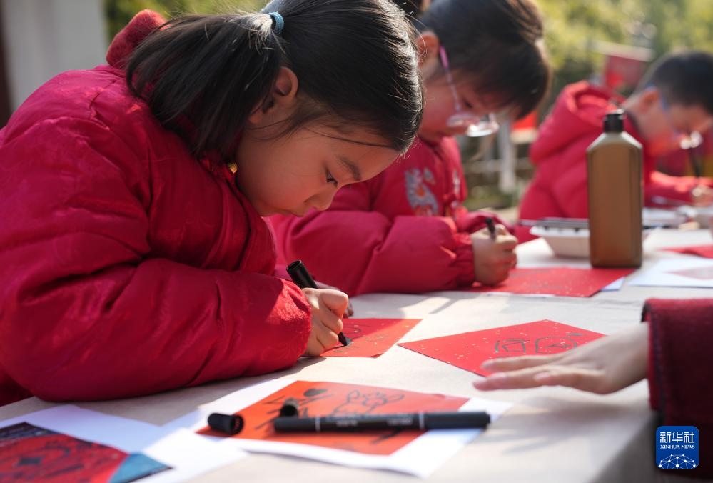 1月23日,小朋友在活动现场体验写福字。新华社记者 韩传号 摄