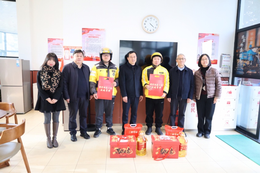 慰问组还走访慰问了困难职工。该职工丈夫因意外丧失劳动能力,家庭医疗支出和子女教育支出压力大,慰问组为其送上慰问金及物资。随后,慰问组来到望江公园战备码头工会驿站,慰问外卖骑手代表。