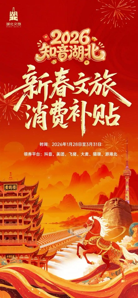 1月28日至3月31日,湖北省将面向所有在湖北及前来湖北的文旅消费者,发放总额高达6000万元的“知音湖北”新春文旅消费补贴,真金白银惠民促消费。湖北省文化和旅游厅、湖北省财政厅1月27日联合宣布,发放新春文旅消费补贴,旨在为激活新春文旅市场,让人民群众乐享新春佳节。