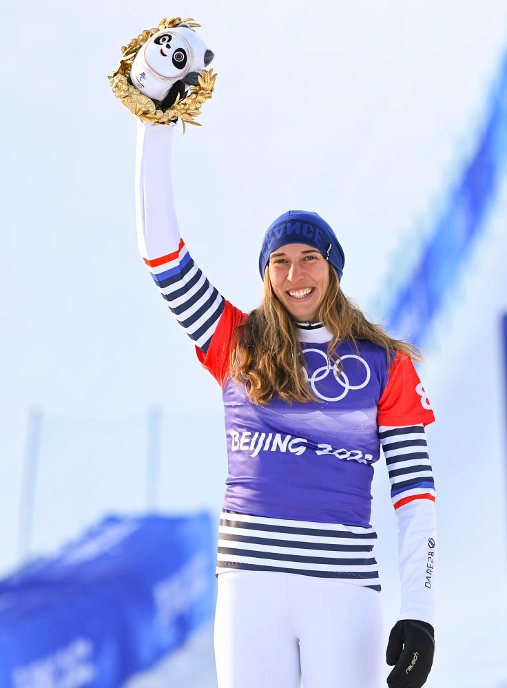 2022年2月9日,获得亚军的法国选手克洛艾·特雷斯珀什在颁发纪念品仪式上。当日,北京2022年冬奥会单板滑雪女子障碍追逐决赛在张家口云顶滑雪公园举行。新华社记者 胡虎虎 摄