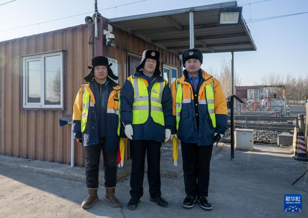 2月1日,通让线27公里道口工长徐中成(左二)与工人彭博(左一)、张浩在道口值班室前合影。新华社记者 连振 摄