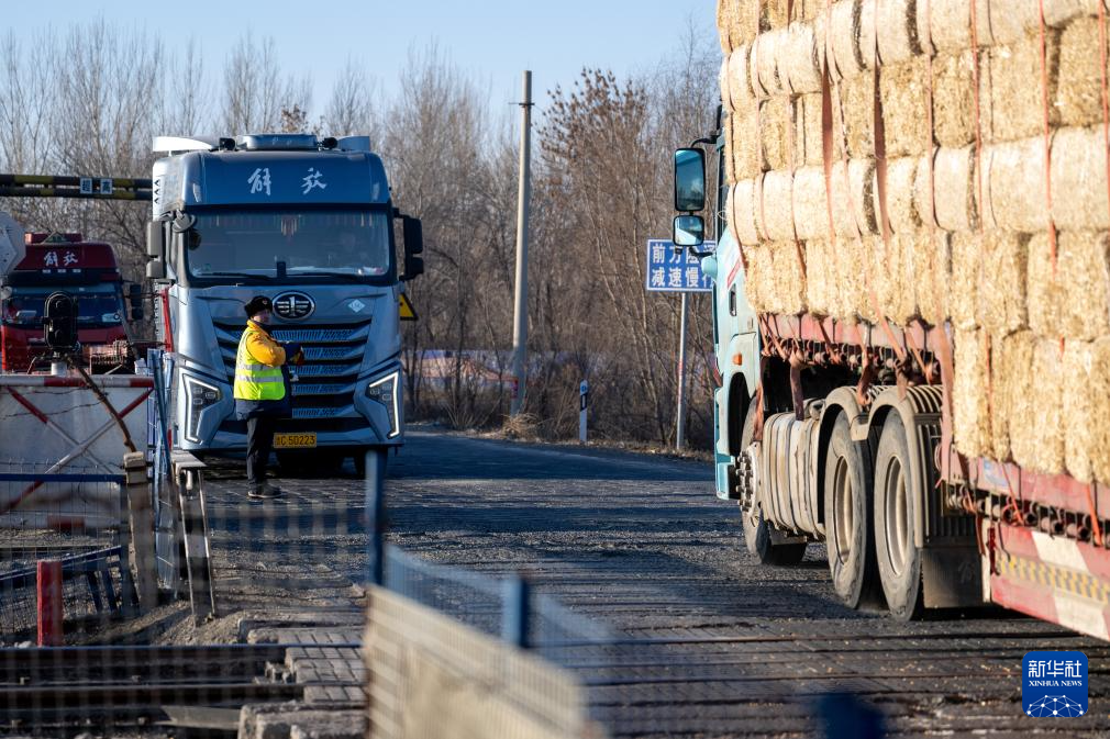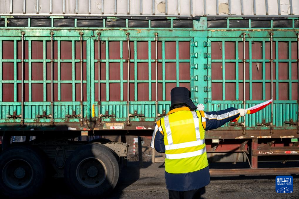 2月1日,工人张浩在道口指挥过往车辆通行。新华社记者 连振 摄