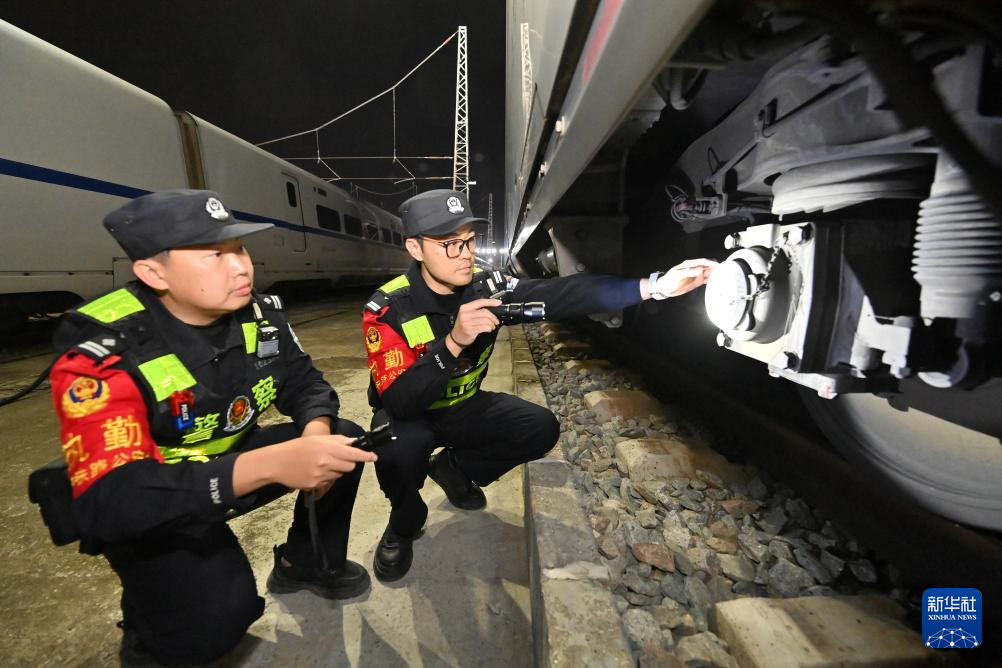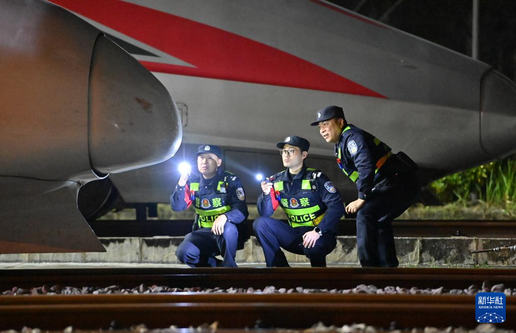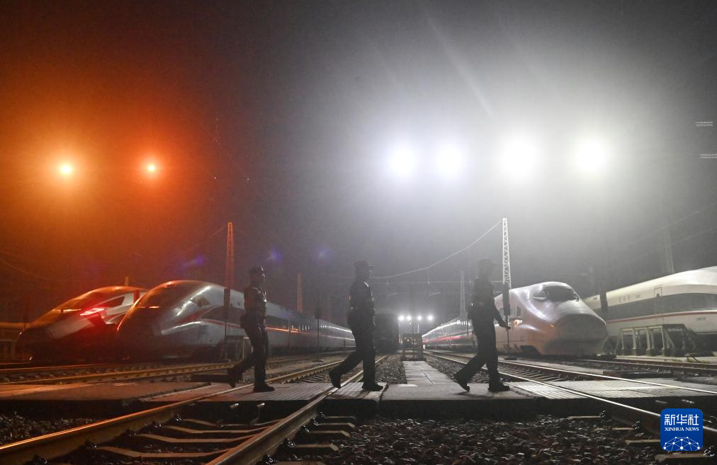 2月2日凌晨,南宁铁路公安局南宁公安处长岗岭站派出所民警在南宁动车所巡逻,认真检查各种设施安全情况,守护即将开启的2026年春运。