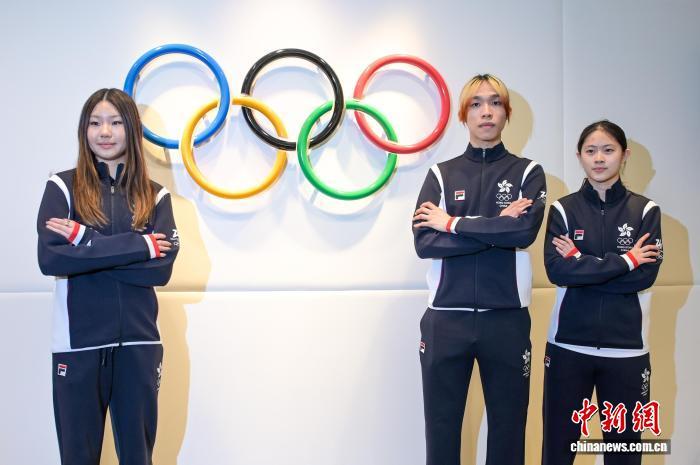 2月2日,中国香港体育协会暨奥林匹克委员会在香港奥运大楼举行“2026年米兰-科尔蒂纳冬奥会中国香港代表团授旗典礼”。图为出战高山滑雪项目的金咏晞(左一),以及出战短道速滑的郭子峰(中)、林静欣。中新社记者 陈永诺 摄