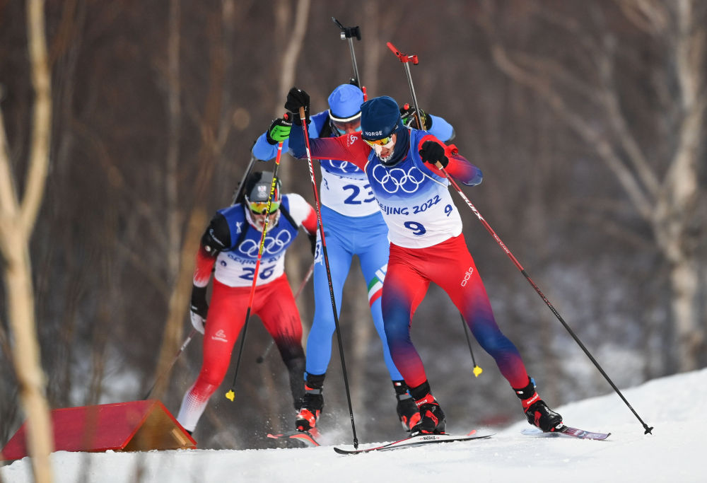 2022年2月18日,挪威选手斯图拉·霍尔姆·莱格雷德(前)在比赛中。当日,北京2022年冬奥会冬季两项男子15公里集体出发比赛在国家冬季两项中心举行。新华社记者 邓华 摄