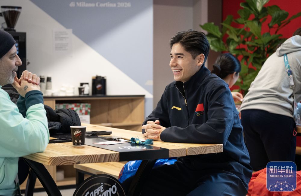 在意大利米兰奥运村,中国短道速滑队运动员刘少昂(右)与人交谈。新华社记者 张豪夫 摄