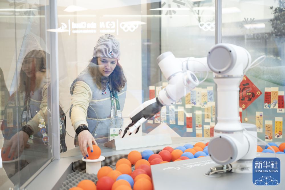 在意大利米兰奥运村,法国冰球队运动员在赞助商阿里云展台体验智能徽章交换。新华社记者 张豪夫 摄