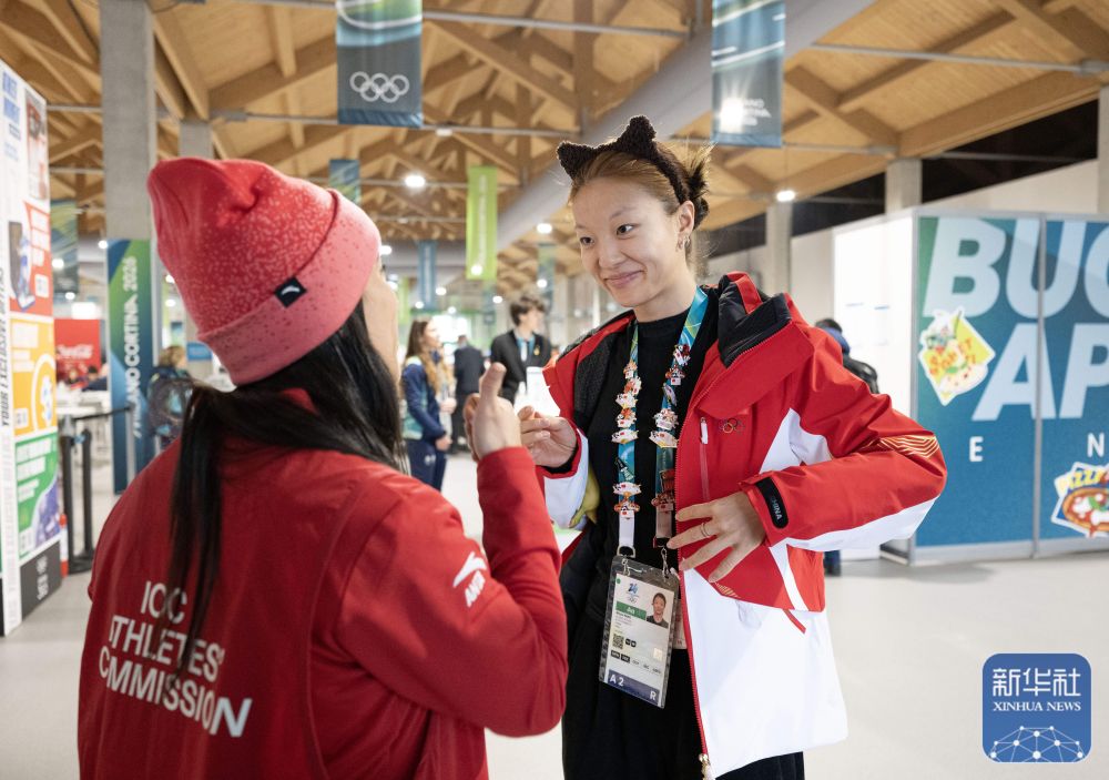 在意大利米兰奥运村,中国速度滑冰队运动员杨滨瑜(右)与工作人员交换徽章。新华社记者 张豪夫 摄
