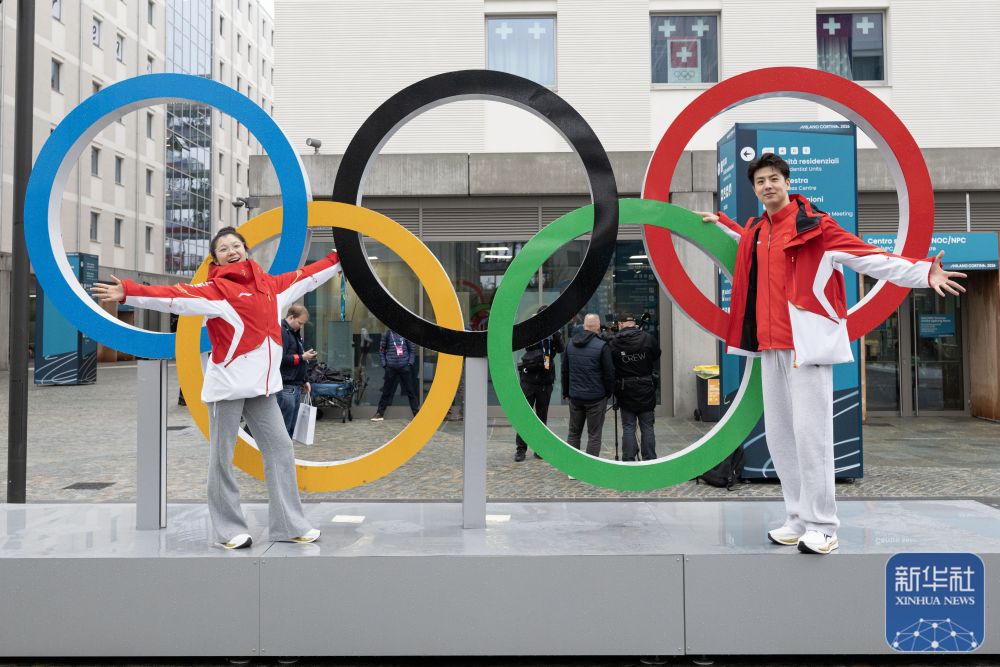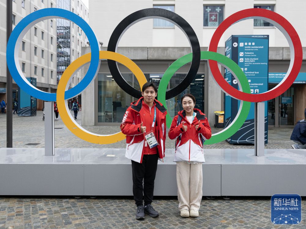 在意大利米兰奥运村,中国花滑队运动员王诗玥(左)、柳鑫宇与奥运五环合影。新华社记者 张豪夫 摄