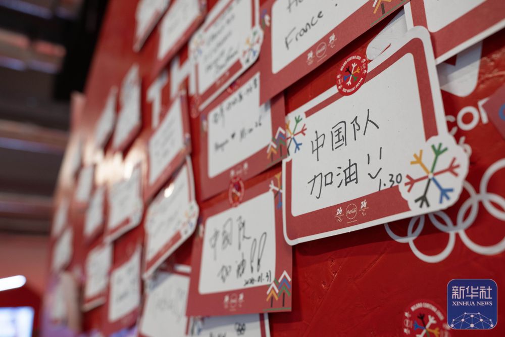 这是2月3日在意大利米兰奥运村拍摄的“中国队加油”祝福贴纸。新华社记者 张豪夫 摄