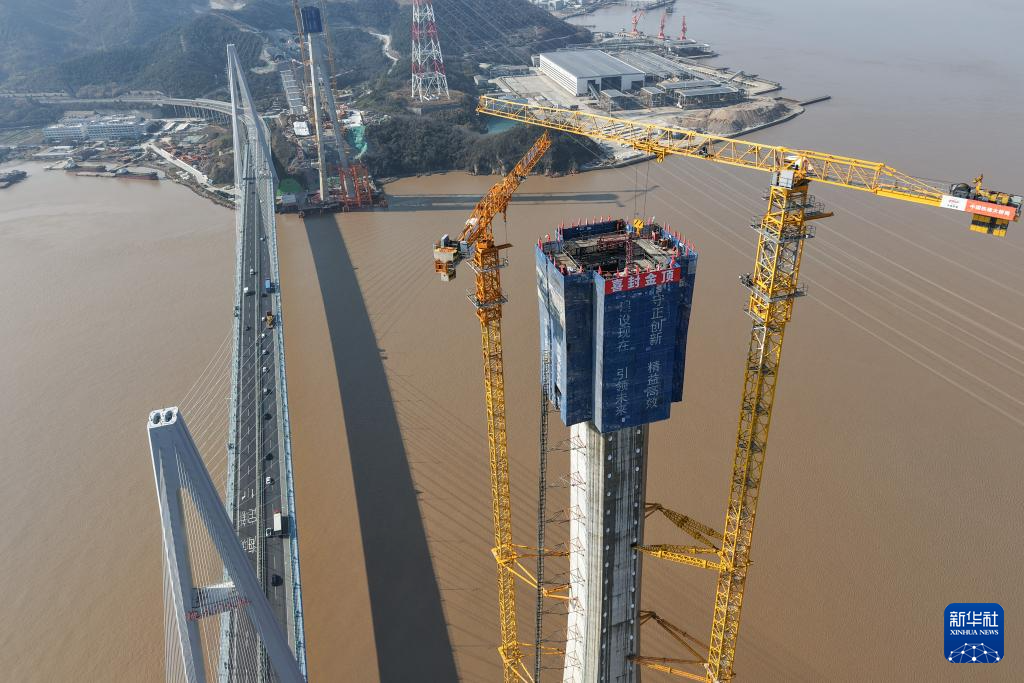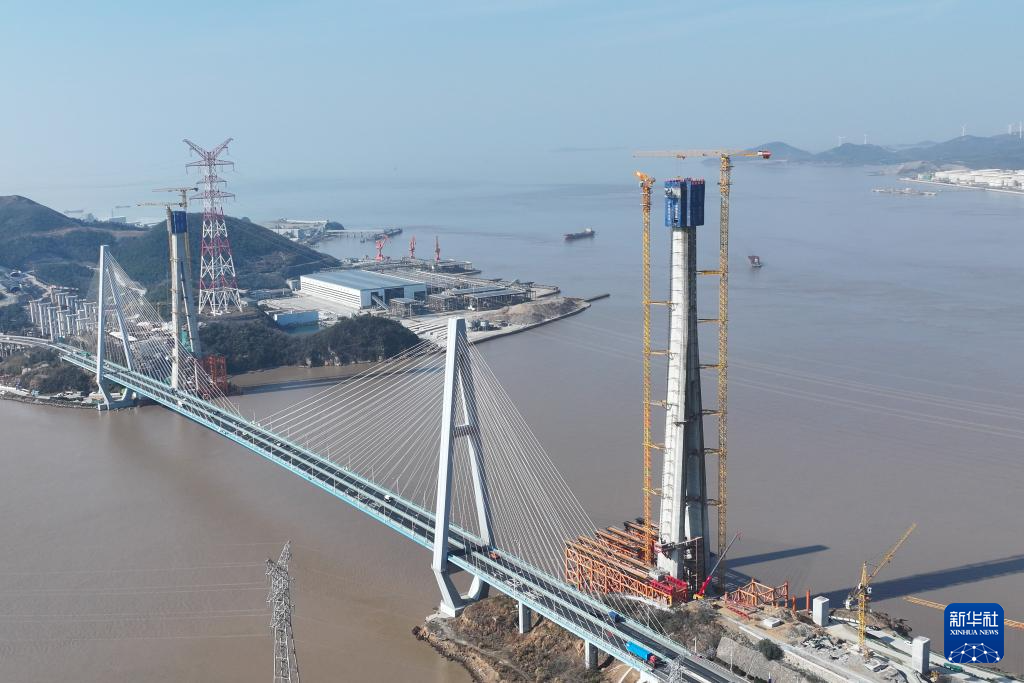 2月4日拍摄的甬舟铁路桃夭门公铁两用大桥6号主塔(右侧),承台以上高度达198.1米(无人机照片)。临近主塔的是桃夭门大桥,也是舟山跨海大桥的重要组成部分。新华社记者 黄宗治 摄