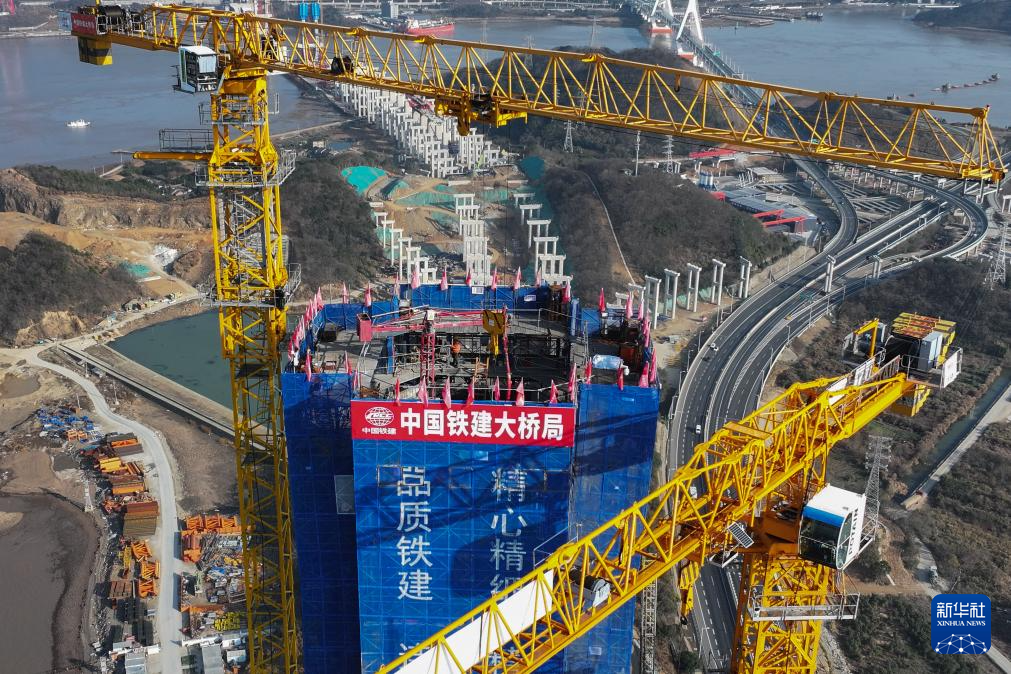 2月4日拍摄的甬舟铁路桃夭门公铁两用大桥6号主塔封顶施工现场,承台以上高度达198.1米(无人机照片)。新华社记者 黄宗治 摄