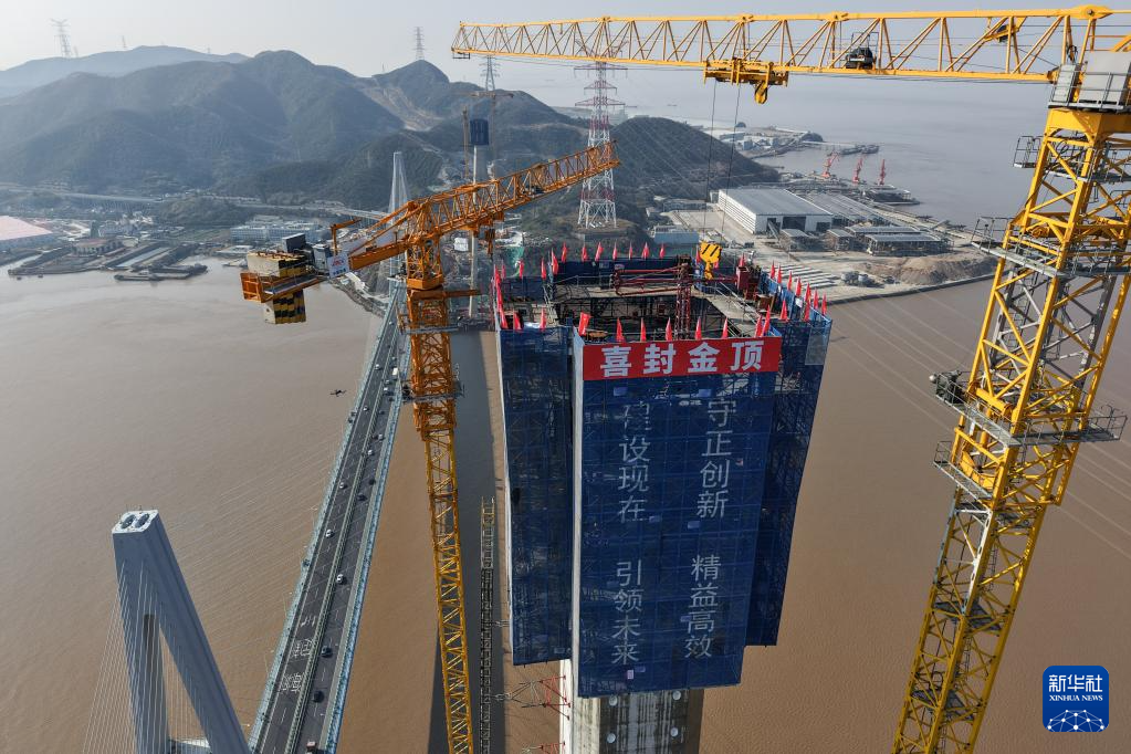 2月4日,建设者在甬舟铁路桃夭门公铁两用大桥6号主塔上进行封顶施工作业(无人机照片)。新华社记者 黄宗治 摄