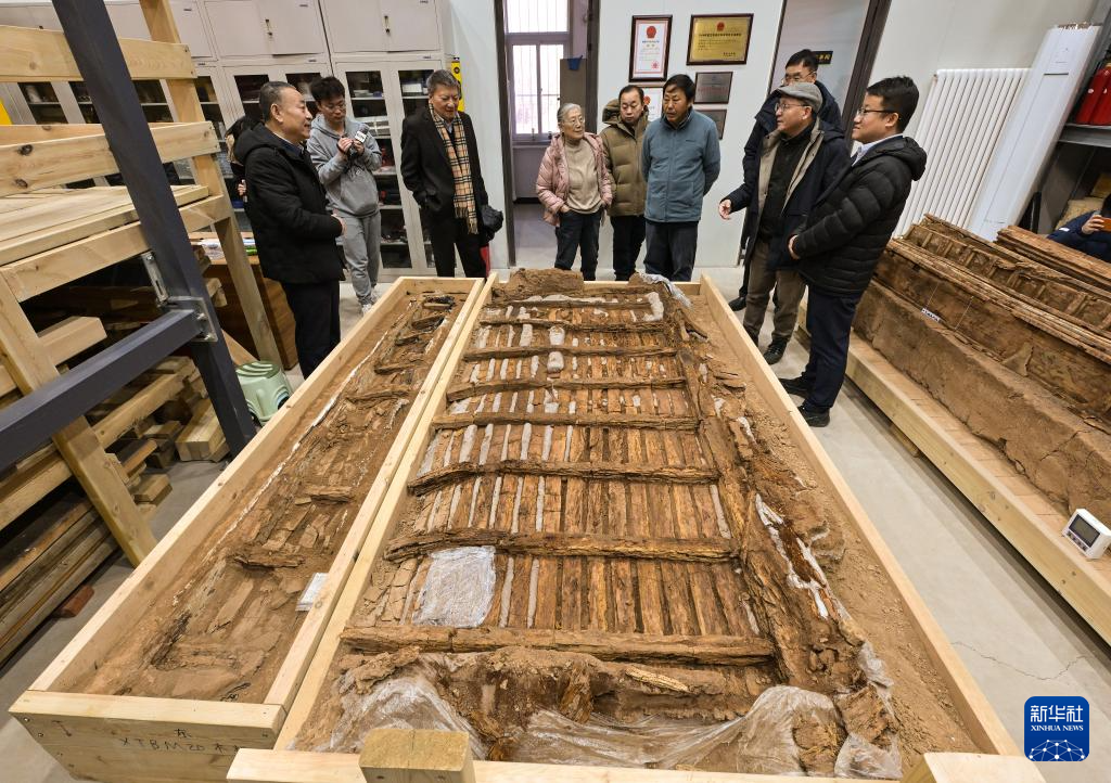 专家们在实验室考古方舱内察看墓葬M20出土的完整木榻(2月1日摄)。新华社记者 李贺 摄