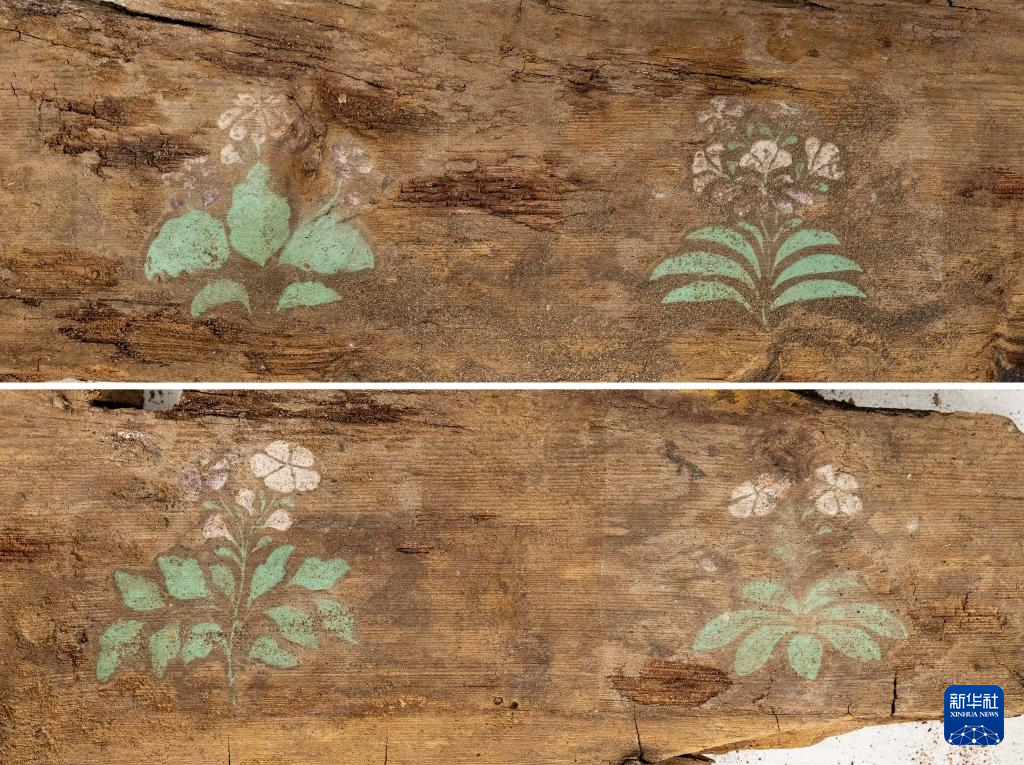 拼版照片:这是在实验室考古方舱内拍摄的墓葬M20出土棺板上的彩绘花卉图案(2月1日摄)。新华社记者 李贺 摄
