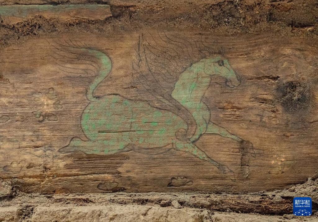 这是在实验室考古方舱内拍摄的墓葬M20出土的木棺座壸门内的彩绘“翼马”图案(2月1日摄)。新华社记者 李贺 摄