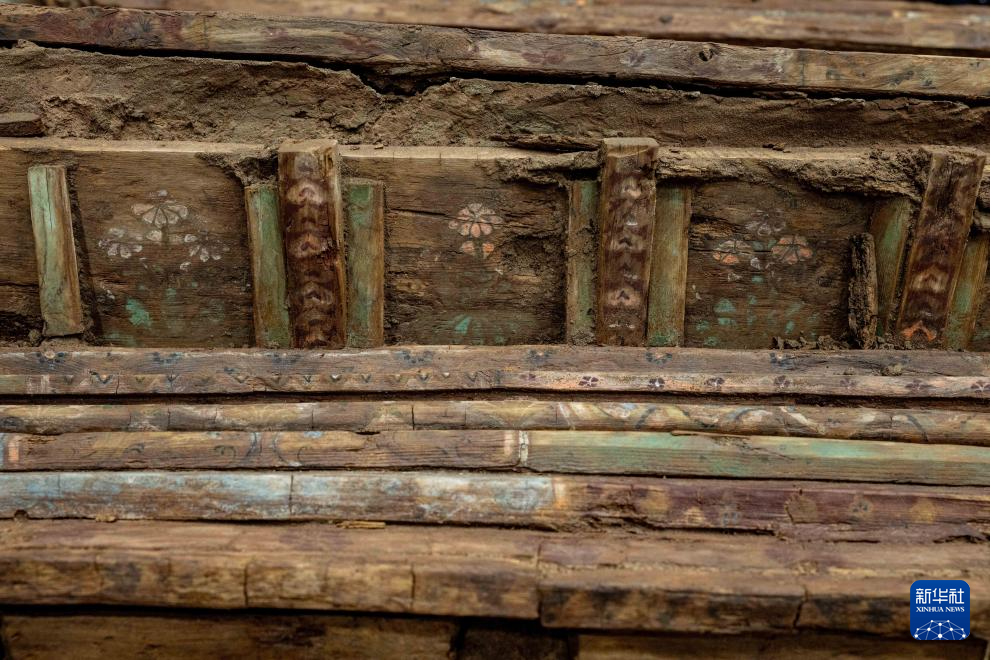 这是在实验室考古方舱内拍摄的墓葬M20出土木棺座叠涩上的彩绘图案(2月1日摄)。新华社记者 李贺 摄