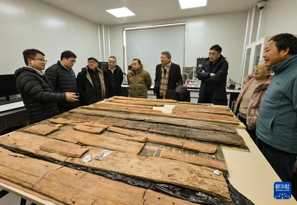 中国社会科学院科技考古与文化遗产保护重点实验室副研究员刘勇(左一)在实验室考古方舱内向专家们介绍墓葬M20出土的木棺彩绘情况(2月1日摄)。新华社记者 李贺 摄