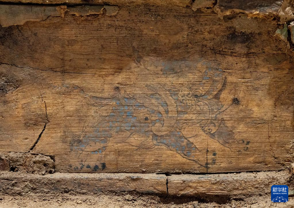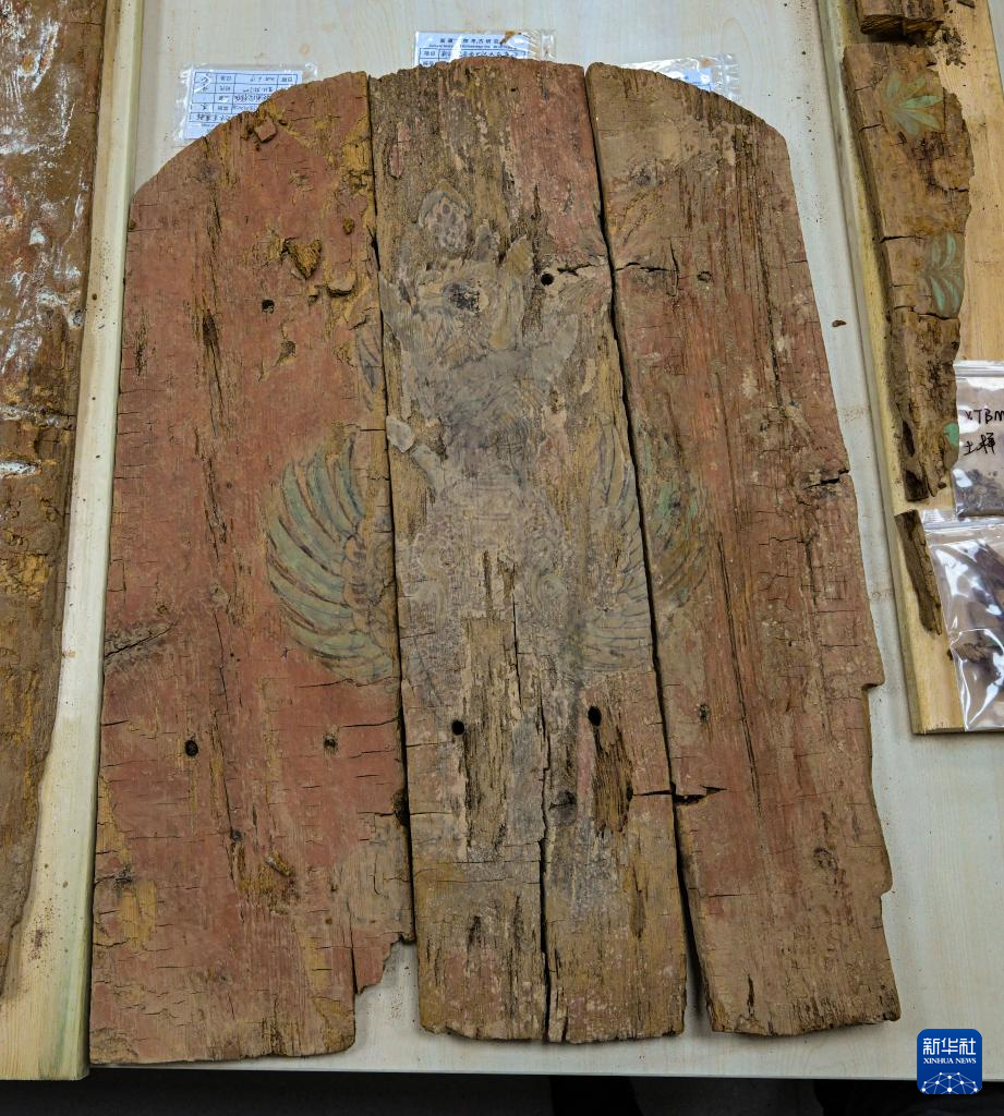 这是在实验室考古方舱内拍摄的彩绘着朱雀图案的木棺前档(2月1日摄)。新华社记者 李贺 摄