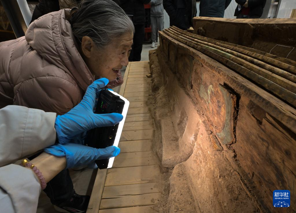 中国社会科学院考古研究所研究员安家瑶在实验室考古方舱内仔细察看墓葬M20出土木棺座上的彩绘图案(2月1日摄)。新华社记者 李贺 摄