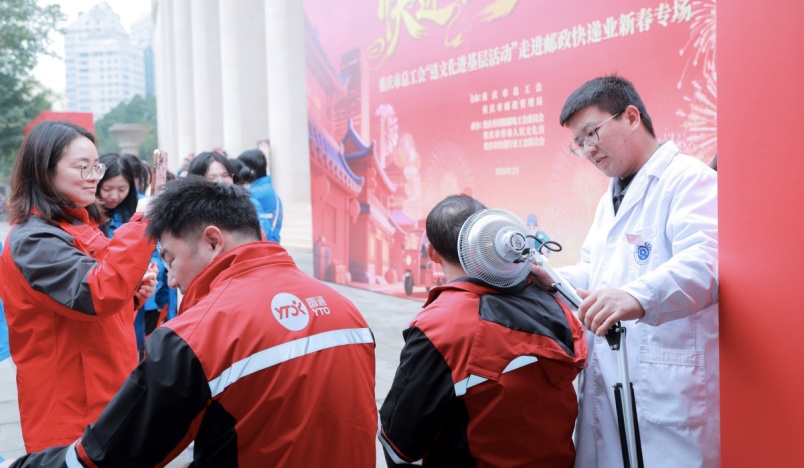 当天下午一点左右,重庆市劳动人民文化宫广场上响起此起彼伏的欢笑。三大电信运营商、邮储银行、铁塔公司以及市总工会杨家坪疗养院等9家单位的服务台前人头攒动。500余名来自邮政、顺丰、中通、韵达等企业的快递小哥结合自身需求,分布在各单位的服务区域,做健康体检、咨询法律问题等。