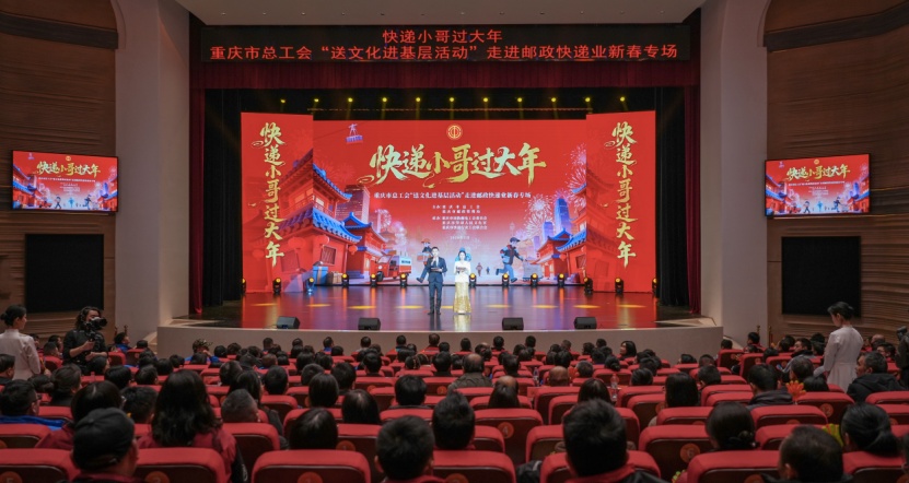 下午两点,市劳动人民文化宫剧场内的灯光骤然点亮,活动由重庆市总工会、市邮政管理局主办,由市国防邮电工会委员会、市快递行业工会联合会、市劳动人民文化宫共同承办的“快递小哥过大年”重庆市总工会“送文化进基层活动”走进邮政快递业新春联欢会正式拉开帷幕。