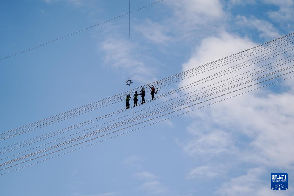 2月5日,施工人员在输电导线跨国连通处作业(无人机照片)。新华社记者 彭奕凯 摄