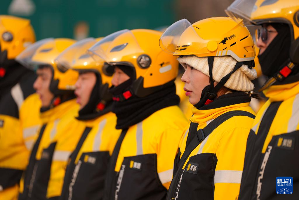 戚德敏(右二)在位于山西省太原市小店区的美团配送合作商服务中心参加早会(1月29日摄)。新华社记者 杨晨光 摄