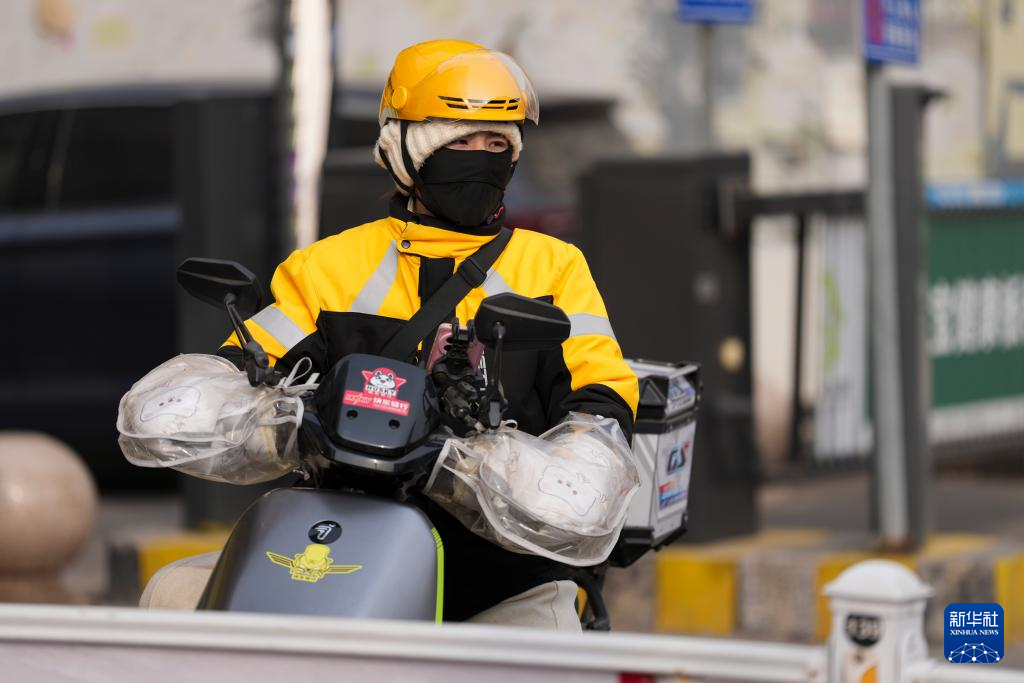 临近春节,订单增多,戚德敏和同事们冒着严寒,将一份份美食准时送达。成为外卖骑手近两年,戚德敏的配送总里程已达3万多公里。工作中,她有过不被理解的委屈,也经常被顾客、商家不经意间的温暖感动着。戚德敏说,作为一名骑手,她的职责就是守护好一份份被等待的温暖。