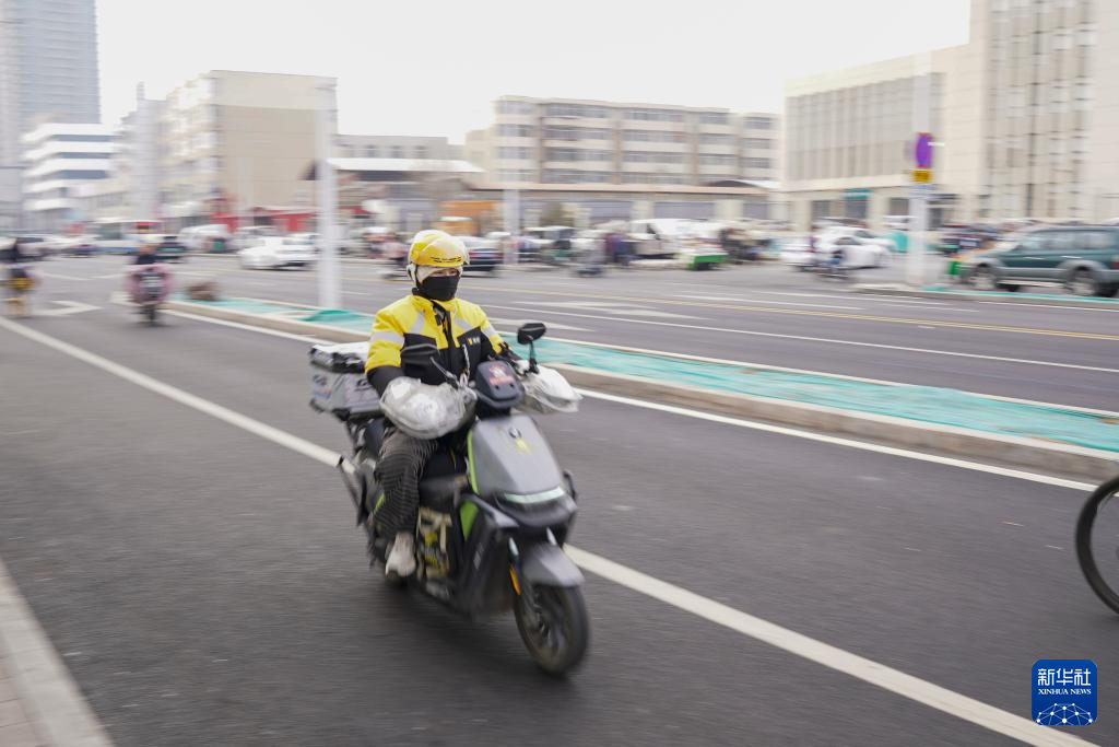 戚德敏骑行在送餐路上(2月4日摄)。新华社记者 杨晨光 摄