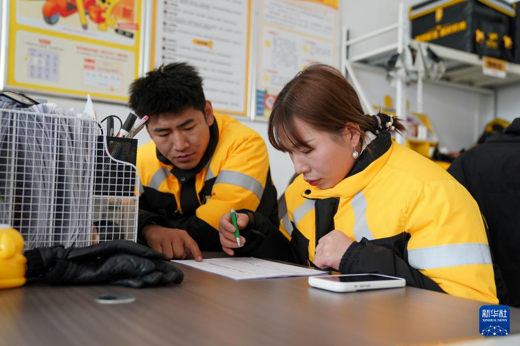 在位于山西省太原市小店区的美团配送合作商服务中心,戚德敏(右)确认上个月的出勤情况(2月4日摄)。新华社记者 杨晨光 摄