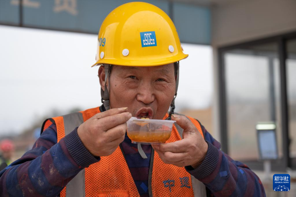 2月5日,在重庆市江津区重庆枢纽港先进机电装备和物流产业园项目建设现场,工人在吃汤圆。新华社记者 陈诚 摄