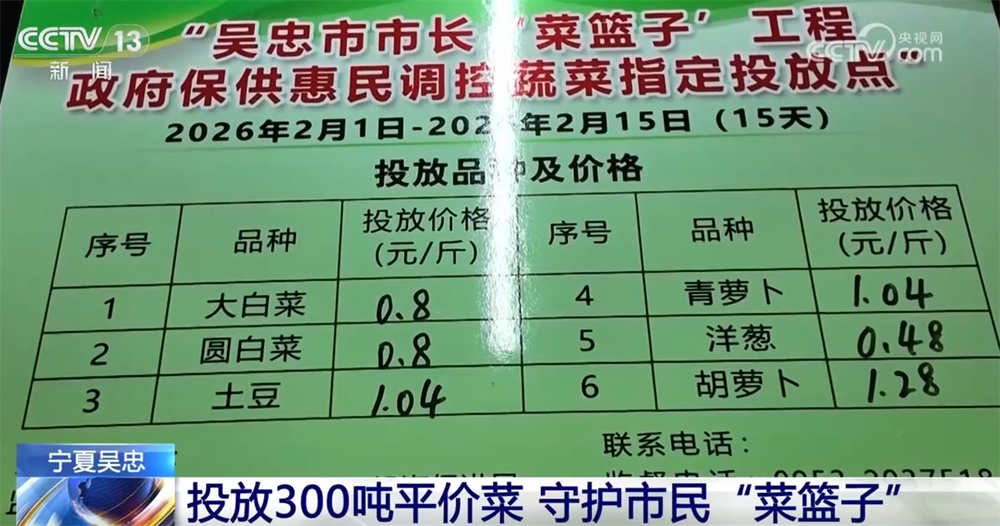 本次吴忠市调控蔬菜投放周期为2月1日至2月15日,全市共设立15个政府指定投放点,所有投放菜品统一执行政府限价,各网点售价不得超过限价标准,并将结合市场批发价格动态微调,确保让利惠民。同时,吴忠市各相关部门将加强监督检查,确保投放蔬菜质量安全、供应充足、价格稳定。