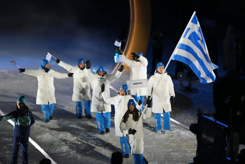 2月6日,希腊体育代表团成员在意大利普雷达佐参加入场仪式。新华社记者 孟永民 摄