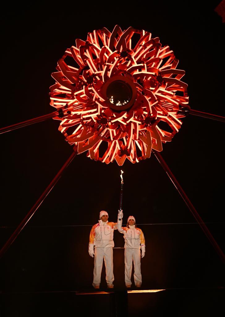 2月6日,在米兰和平拱门,火炬手孔帕尼奥尼(右)和汤巴点燃主火炬。新华社记者 武巍 摄