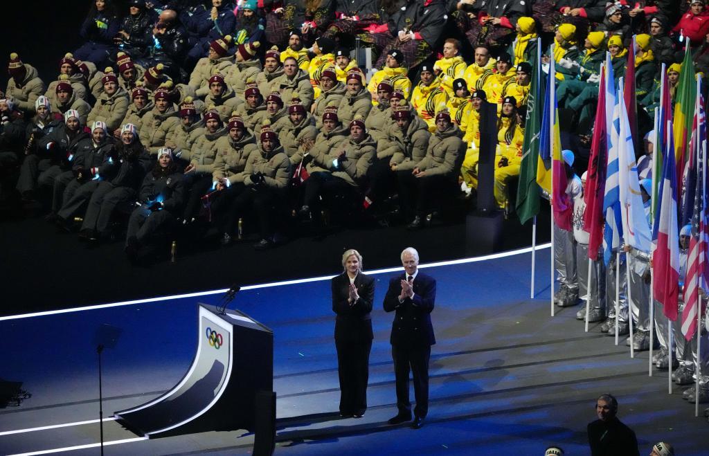 2月6日,国际奥委会主席考文垂(左)和米兰-科尔蒂纳冬奥会组委会主席乔瓦尼·马拉戈在开幕式上。新华社记者 赖向东 摄