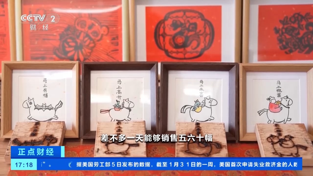 在安徽黄山的徽派版画文化体验馆内,非遗传承人薛寅正带着游客体验制作新年开发的马年创意版画,游客们以刻刀为笔,木板为纸,雕刻制版、滚墨、印画,“马上抱富”“马上有福”等创意版画受到了年轻人的追捧。