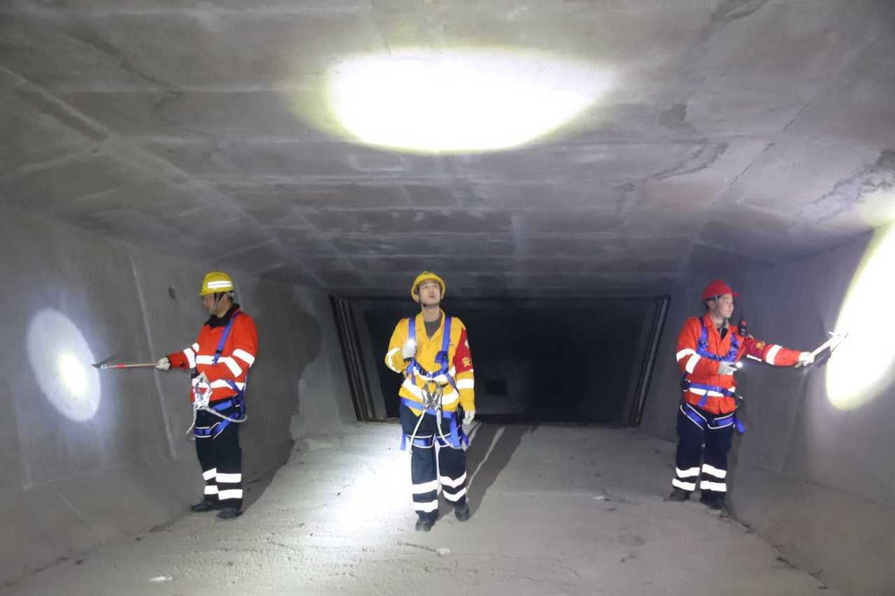 箱梁检查完毕,检修人员又踩着钢梯下到桥台开展作业,这里的空间比箱梁更为狭小,悬空的检修平台下是湍急的河水,身旁是冰冷的桥体,安全绳成为检修人员的“生命绳”。“大家一定要系好安全绳,脚下踩稳,仔细检查每一个部位!”李纳高声提醒道。