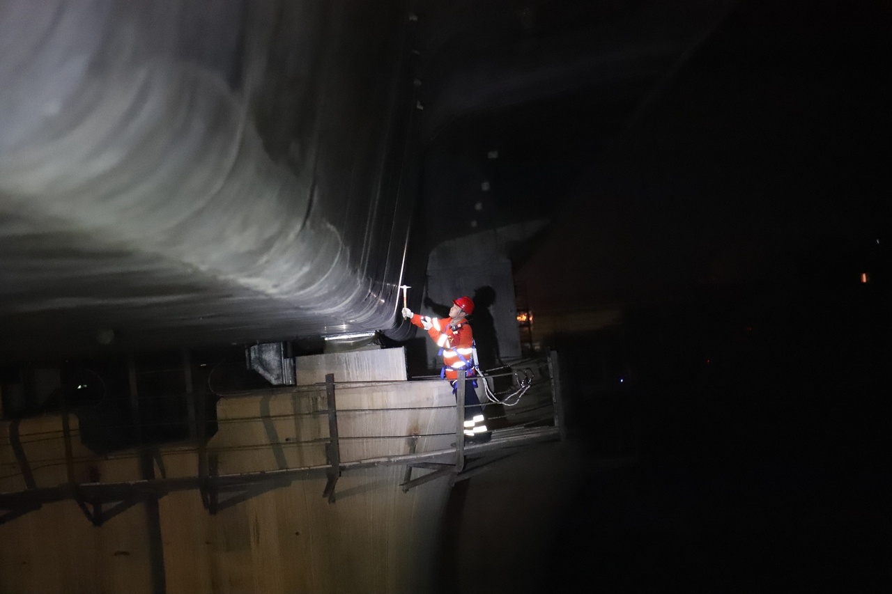 高空作业是此次检修的最大挑战,检修工作的第一站便是大桥的钢管拱结构。李纳和吴小龙一左一右,沿着钢梯稳步攀爬,手持检查锤逐点敲击,“叮叮当当”的敲击声在寒夜的江面上格外清脆,与呼啸的风声交织成独特的“守桥乐章”。