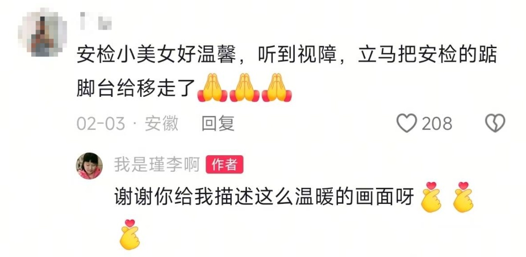 网友“@轩辕”留言:“安检员听到‘视障’,立马移开垫脚台,动作温柔又自然。”
