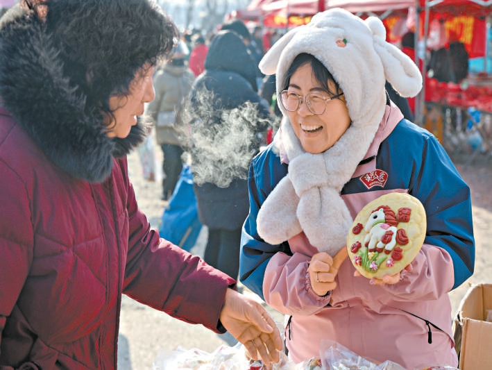 非遗传承人张鑫莹(右)在大集上为顾客展示马年花馍。北京日报记者 白继开 摄